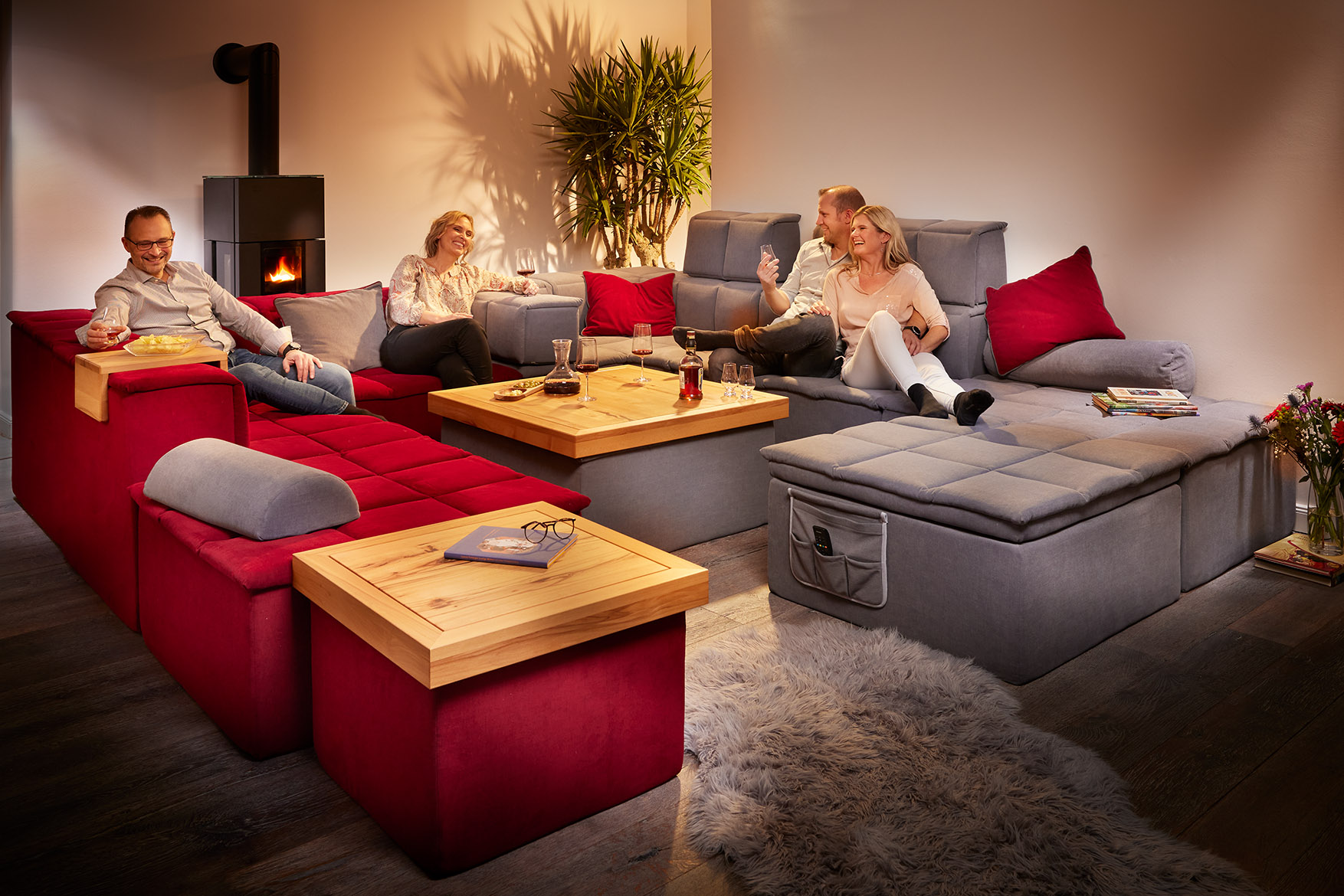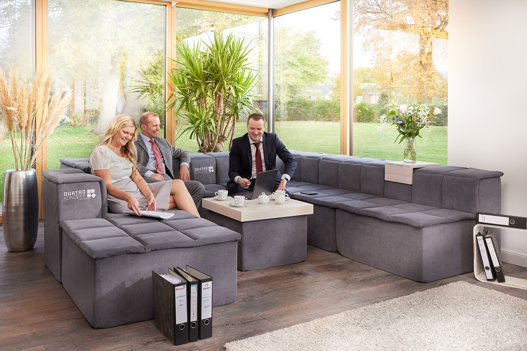 Das große Alleinstellungsmerkmal von Quatrokonzept® ist, dass Sie sich nie festlegen müssen – weder bei der Nutzung noch bei der Größe. Wo ausreichend Raumangebot vorhanden ist, z.B. in einem großen Wohnzimmer, einer Business Lounge oder einem öffentlichen Gebäude, lassen sich alle Module eines Quatrokonzept® jederzeit bis in die kleinste Nische hinein ausbauen und Ihren Anforderungen anpassen.